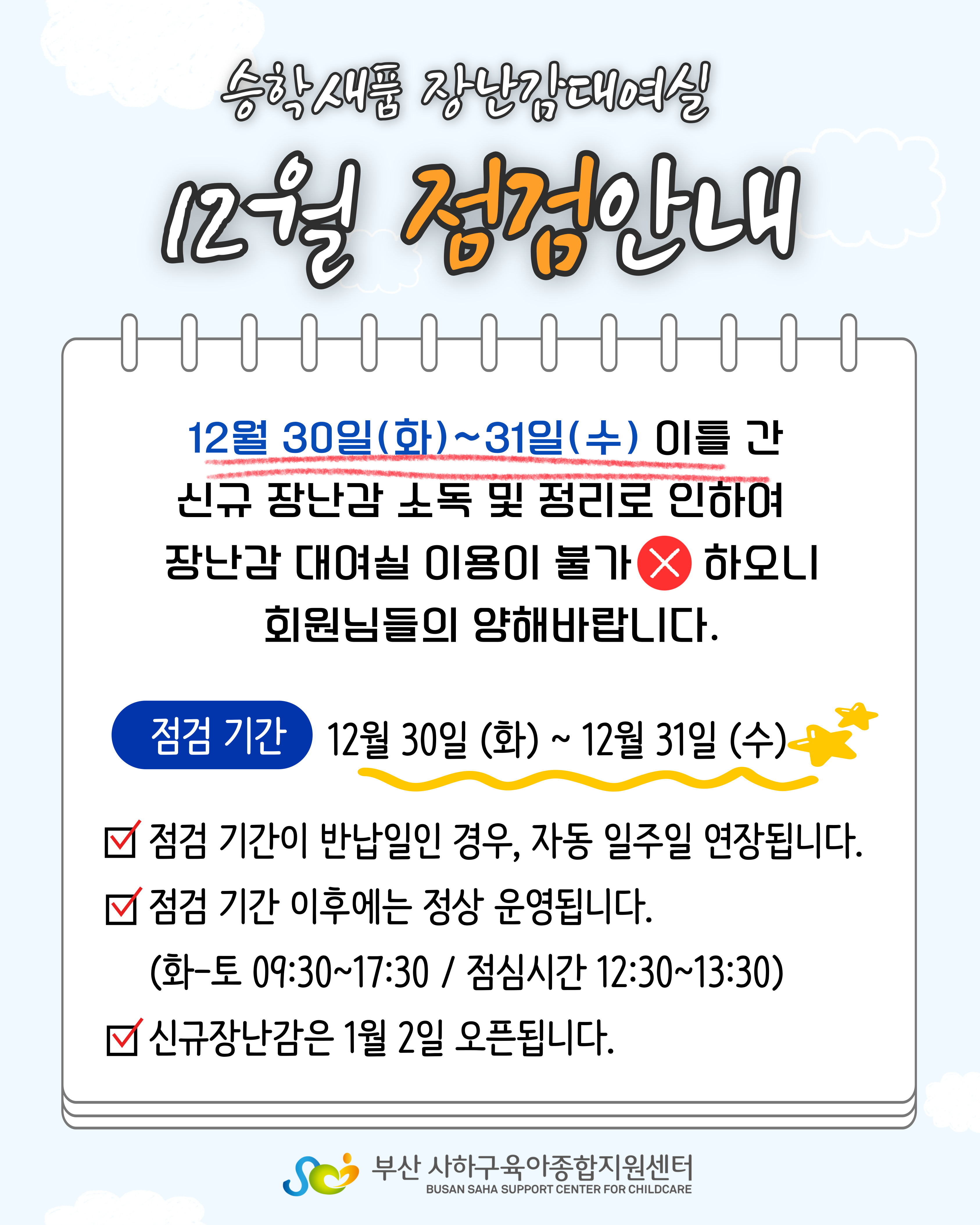 [사하구육아종합지원센터] 12월 승학새품 장난감대여실 점검 안내