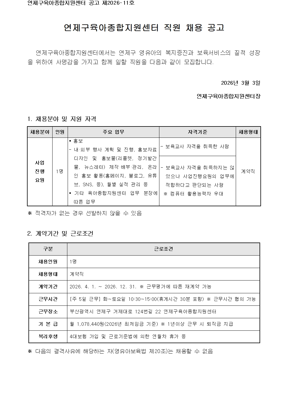 붙임1_연제구육아종합지원센터 직원(사업진행요원) 채용 공고문.hwp