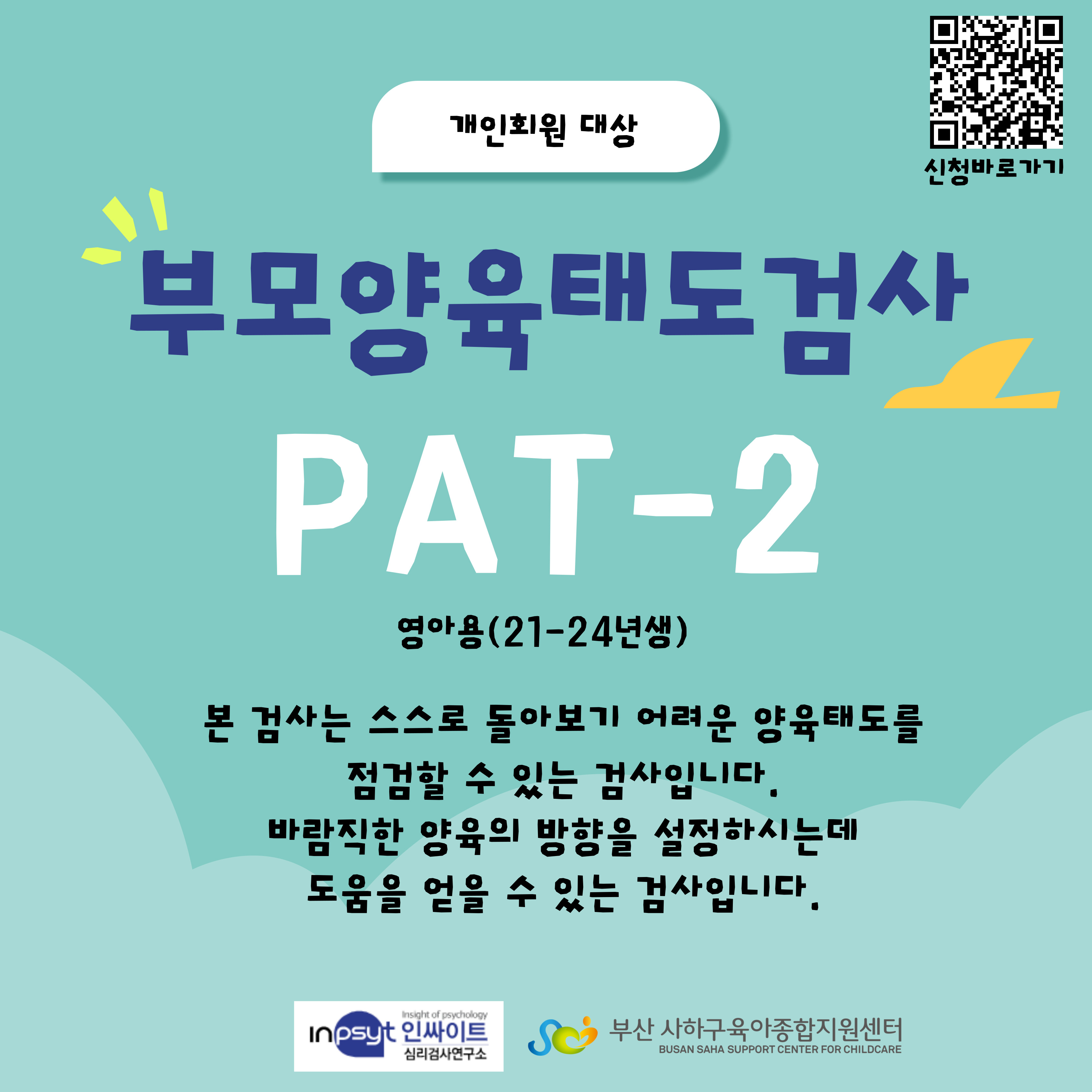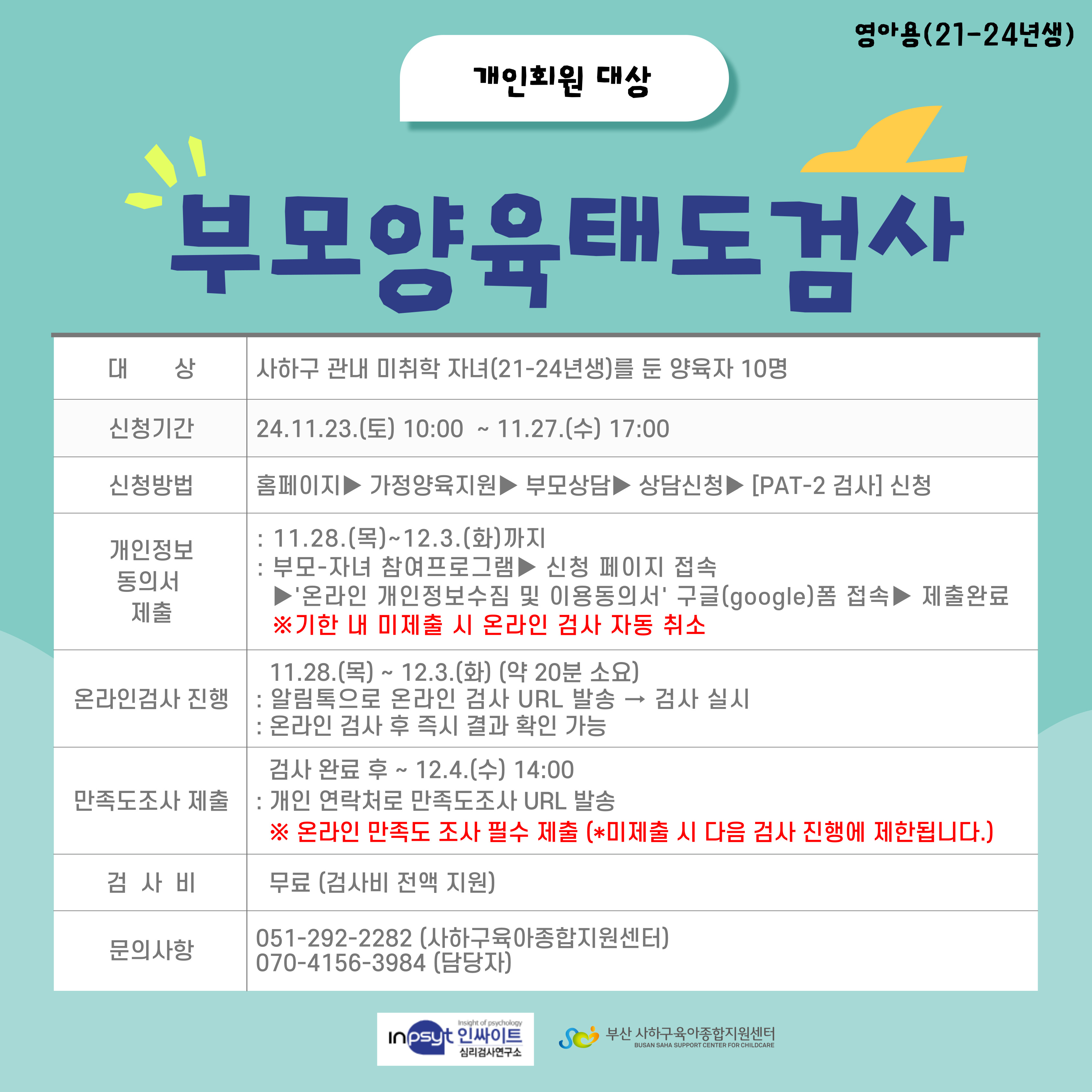 사하구 관내 미취학 자녀를 둔 양육자 10명을 대상으로 [부모양육태도검사(PAT-2)]를 실시합니다.